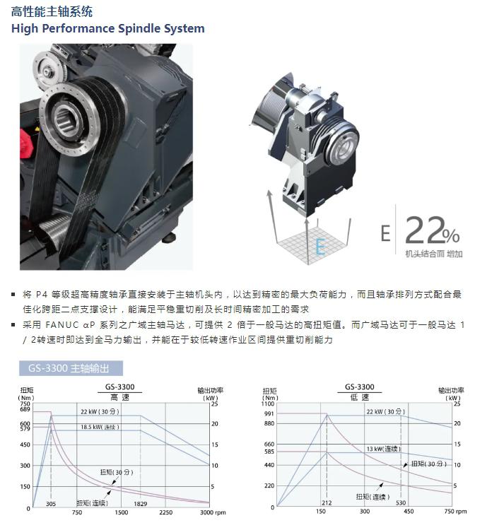主軸采用 FANUC αP 系列廣域主軸馬達(dá)驅(qū)動,可于較低轉(zhuǎn)速作業(yè)區(qū)間滿足重切削的加工需求