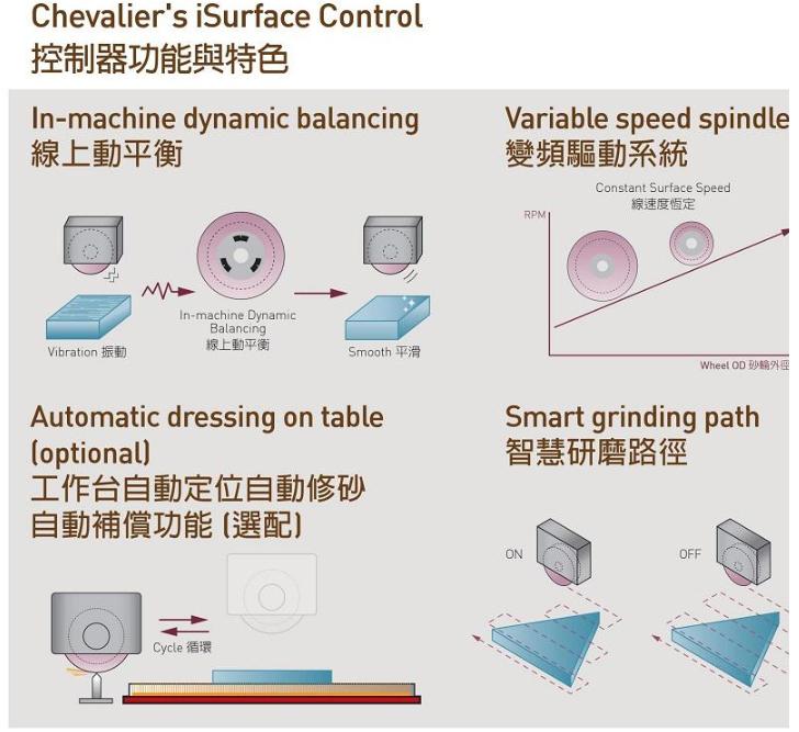 FSG-2048/2064ADIV智慧數(shù)控磨床的核心是iSurface控制器,擁有創(chuàng)新的手動(dòng)線上動(dòng)平衡、變頻驅(qū)動(dòng)系統(tǒng)、加工砂輪線速度恆定、工作臺(tái)自動(dòng)定位、自動(dòng)修砂自動(dòng)補(bǔ)償及智慧研磨路徑功能,讓使用者在研磨加工時(shí),能輕鬆完成設(shè)定,提高生產(chǎn)效率,大幅提升福裕數(shù)控平面磨床的磨削性能。