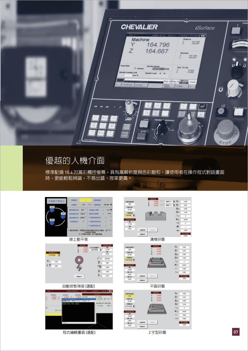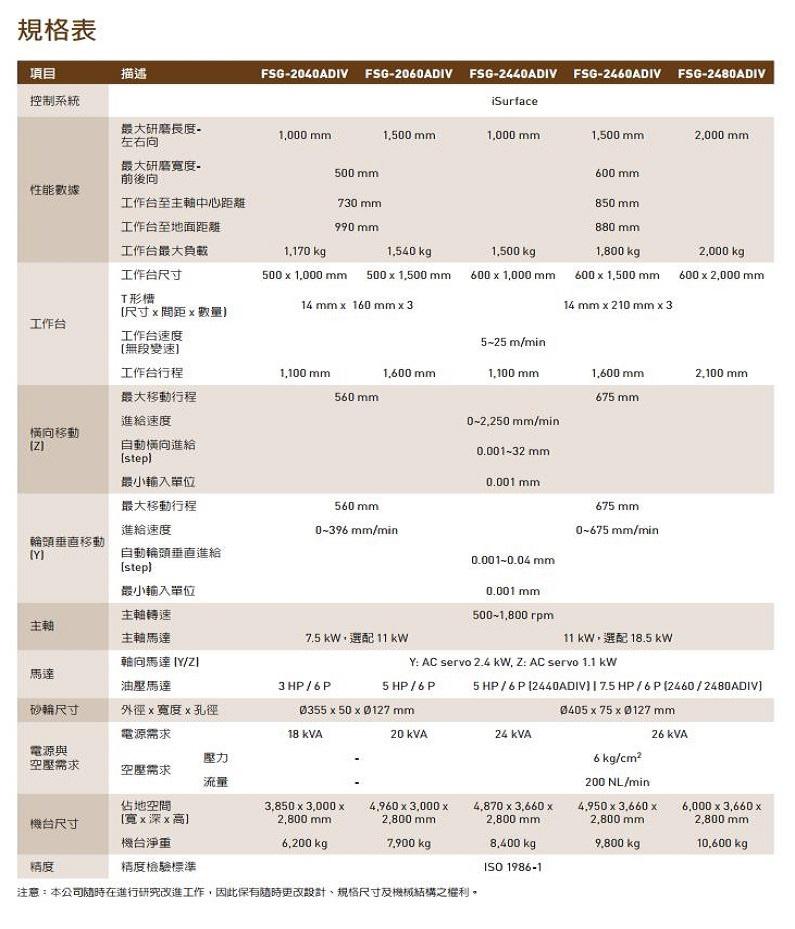 FSG 2048/2064ADIV 動(dòng)柱式數(shù)控平面磨床具有超乎預(yù)期的設(shè)計(jì)特色:包括 iSurface 擁有創(chuàng)新的手動(dòng)線上動(dòng)平衡、變頻驅(qū)動(dòng)系統(tǒng)、 加工砂輪線速度恆定、工作臺自動(dòng)定位、自動(dòng)修砂自動(dòng)補(bǔ)償及智慧研 磨路徑功能等。