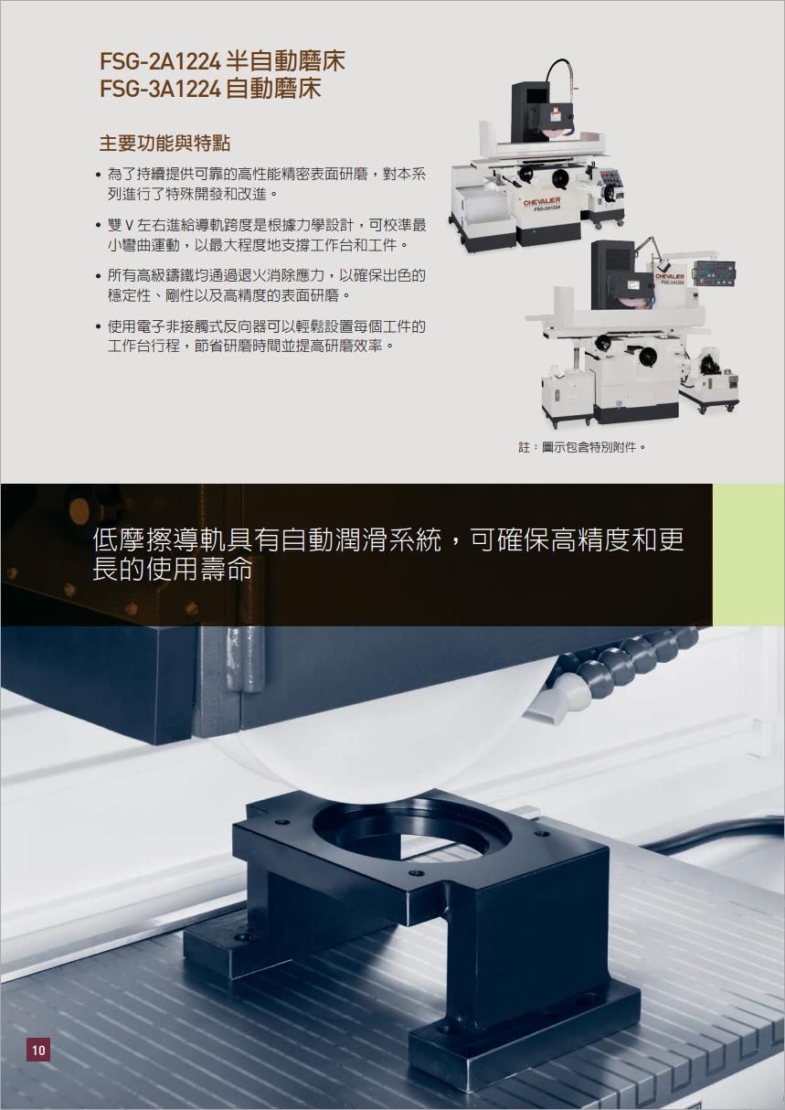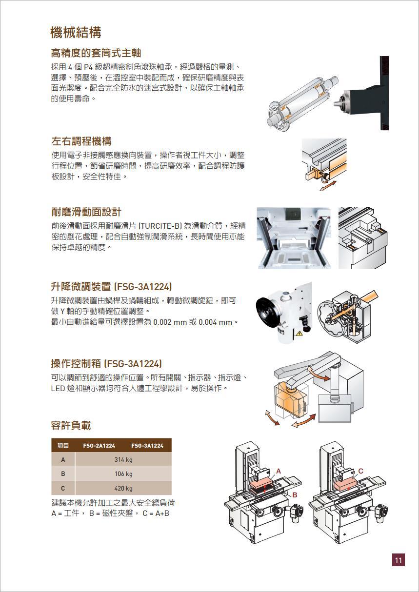 福裕平面磨床,三軸自動磨床,全自動平面磨床,福裕精密磨床,FSG-3A1224工作臺尺寸 ( 寬 x 長) :可達300 x 600mm,三軸自動磨床,全自動平面磨床,福裕精密磨床,福裕磨床雙"V" Turcite-B 之鞍座軌道系統(tǒng),X 軸以油壓驅動速度達25 m/min